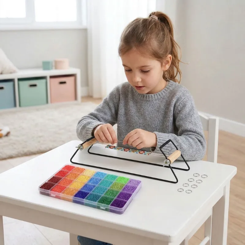 Používáme tuto sadu během rodinného času. Zatímco si povídáme, naše dítě tiše tká náramky, buduje soustředění a jemnou motoriku, aniž by si toho všimlo.
