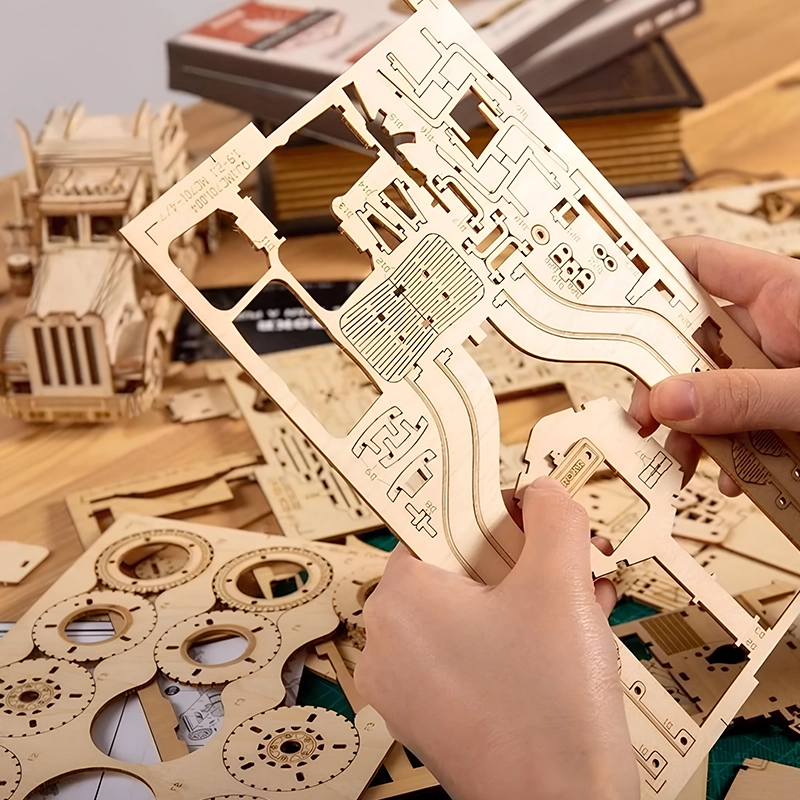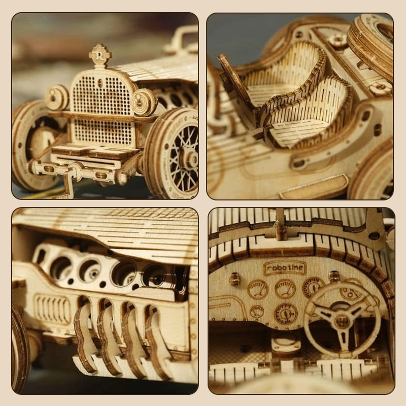 Tato dřevěná sada byla perfektní na deštivé odpoledne. Bavilo mě plánovat každý krok a sledovat, jak se proměňuje v parádní auto.
