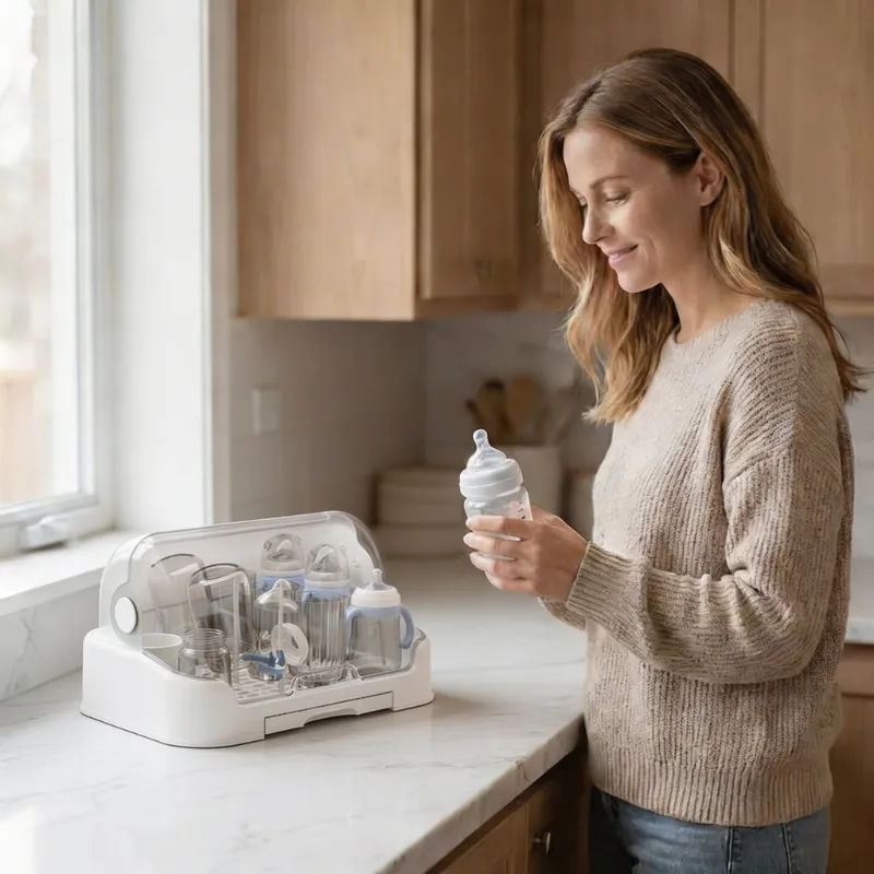 Díky tomuto sušáku je úklid tak rychlý. Stačí opláchnout, vložit lahvičky dovnitř, zavřít víko a jdu si hrát s miminkem!