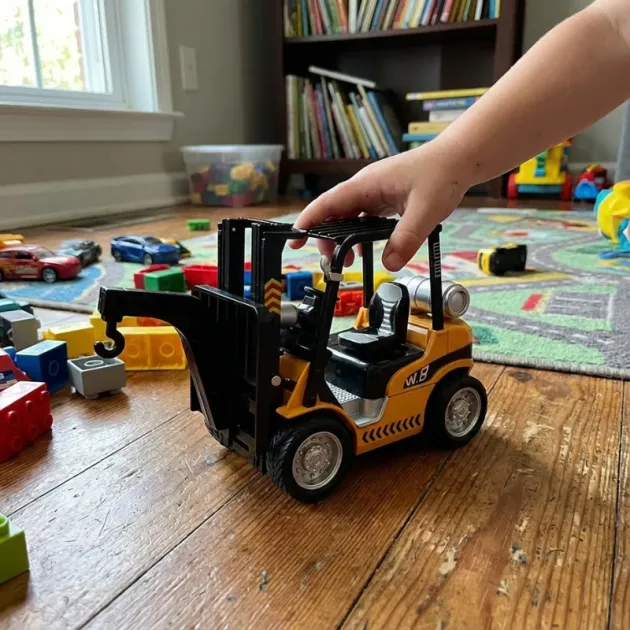 Když se objeví vysokozdvižný vozík, obývák je opravdu hlučný! S kamarády střídavě nakládáme na něj malé autíčka. Nikdy to neomrzí.