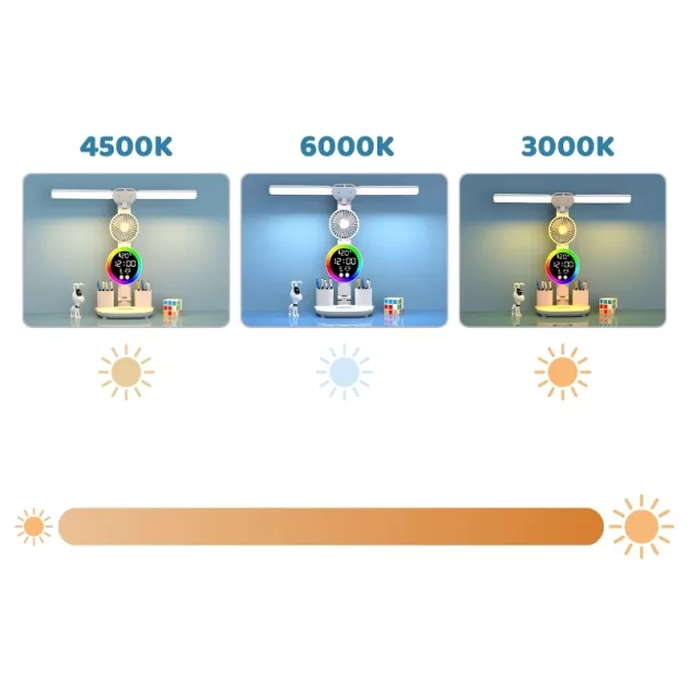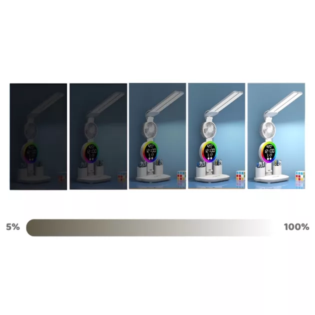 Skvěle se vejde na můj malý stůl. Líbí se mi měnit světlo, když čtu nebo píšu, a větráček je bonus během léta.