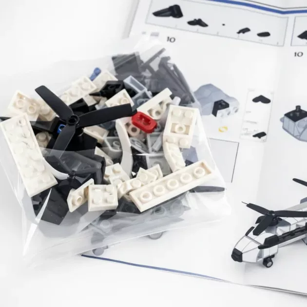 Moje dcera se při stavění vrtulníku nemohla přestat usmívat. Návod byl jednoduchý a teď se na něj pyšně dívá na své poličce!
