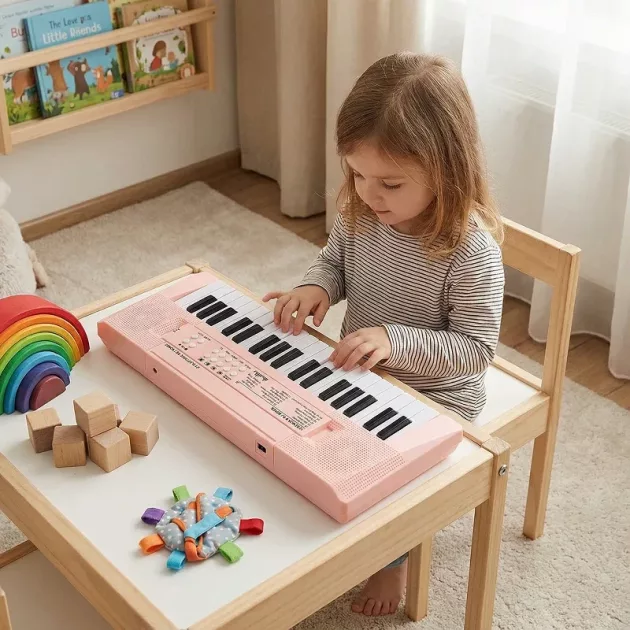 Rozvoj dovedností - Cvičení na klávesách pomáhá rozvíjet koordinaci rukou. Vaše dítě se při každé lekci naučí rytmus a základní hudební pojmy.
