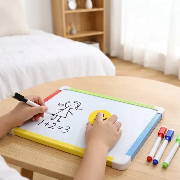 Naše malá tabule putuje každý den z ložnice do obýváku. Dcera ji používá na pravopis, čísla i bláznivé obrázky. Už žádné skvrny od fixů na stolech.