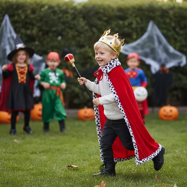 Červený královský sametový plášť a zlatá koruna – halloweenský kostým pro děti