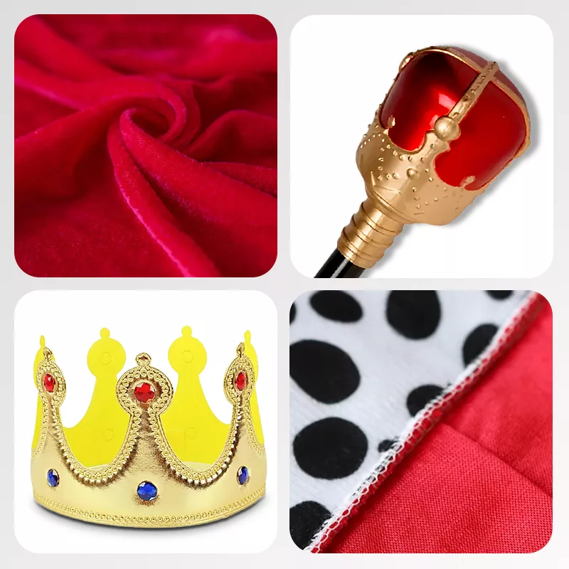 Představivost roste, když malí nosí tento sametový plášť. Každý detail inspiruje kreativní hru, od jasně červené látky až po zlatou korunu. Oblékání je snadné, což činí každou událost kouzelnou a bez stresu. Sledujte úsměvy, jak se vaše dítě okamžitě promění.