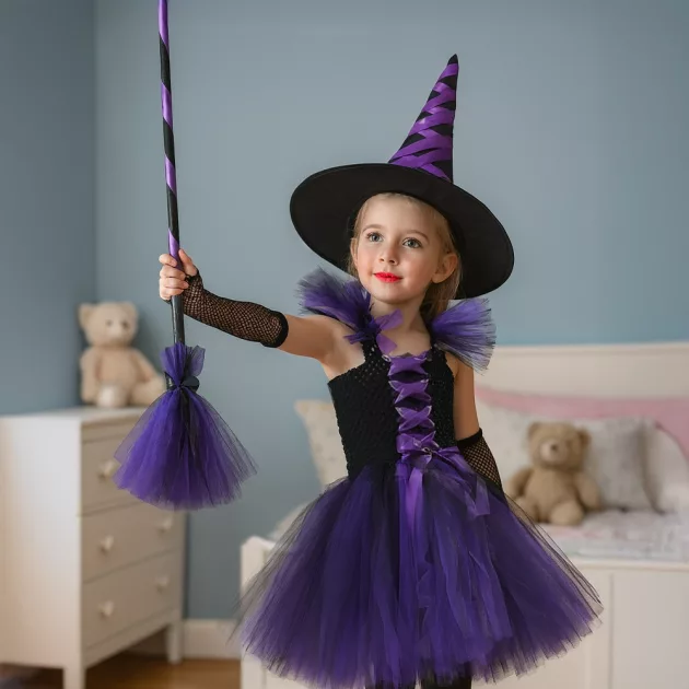 Moje dítě to mělo na školní halloweenské party a všem se to líbilo! Koště měla u sebe několik dní a šaty i po vyprání vypadají jako nové.
