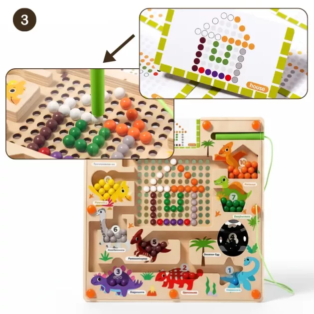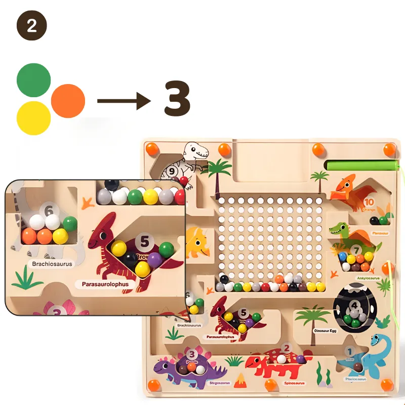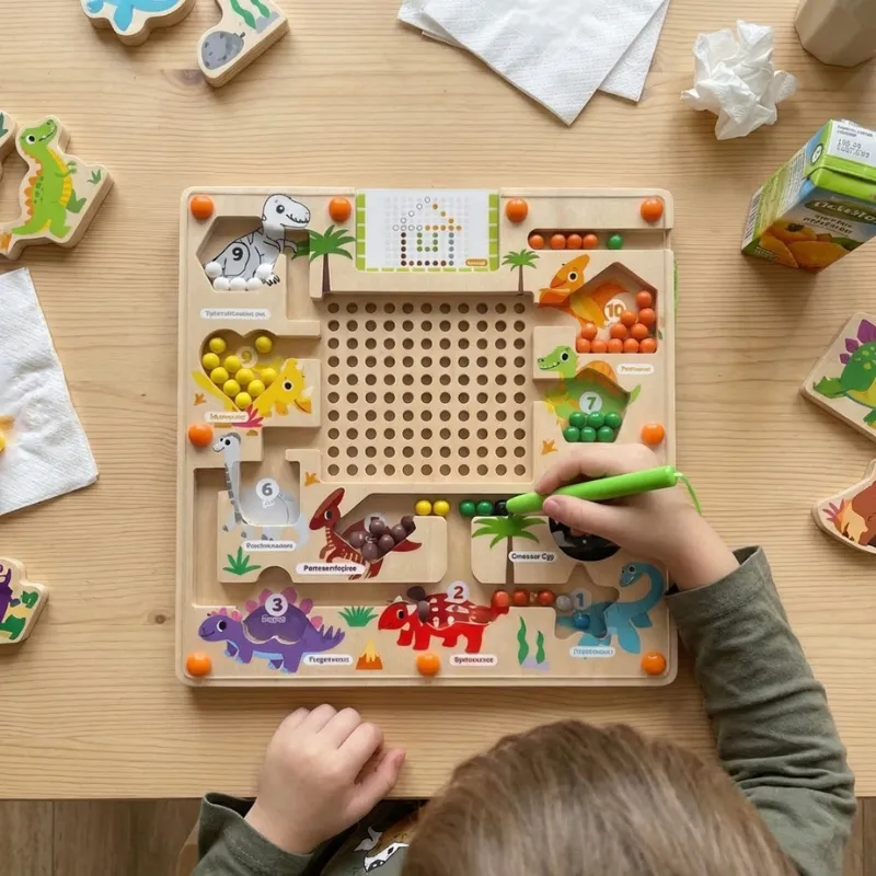 Darovali jsme tohoto dřevěného dina neteři k narozeninám. Okamžitě začala přiřazovat cesty korálků k číslům vytištěným vedle nich, a to úplně sama.