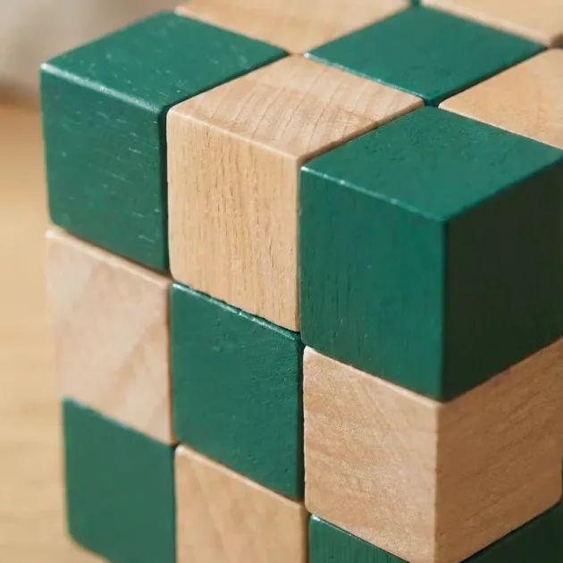 Dřevěná kostka je pevná a přežila už mnoho pádů. Děti baví výzva a já oceňuji, že to není další obrazovka.