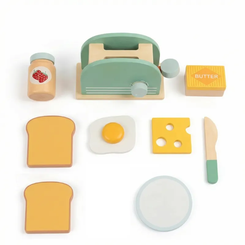 Moje dvojčata milují předstírání, že servírují snídani. Dřevěná sada je hladká a dobře se drží malým ručičkám.